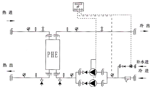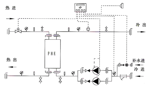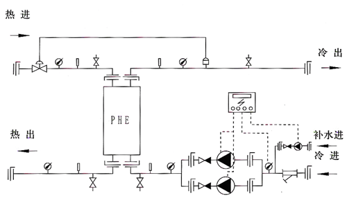 1.Y型過(guò)濾器 2.電動(dòng)調(diào)節(jié)閥 3.壓力表 4.溫度表 5.蝶閥 6.除污器 7.循環(huán)泵