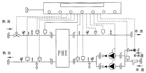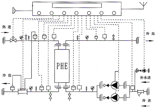 全自動(dòng)無(wú)人值守現(xiàn)場(chǎng)控制換熱機(jī)組,具有手動(dòng)控制換熱機(jī)組功能外,一次網(wǎng)配有電動(dòng)調(diào)節(jié)閥,控制二次網(wǎng)的供水溫度,具有室外溫度補(bǔ)償功能,循環(huán)泵采用變頻控制,利用二次網(wǎng)供回水壓差作為反饋信號(hào),二次網(wǎng)進(jìn)行變量控制,不水泵采用變頻補(bǔ)水,根據(jù)二次網(wǎng)回水壓差作為反饋信號(hào)。所有水泵,電動(dòng)調(diào)節(jié)閥,二次網(wǎng)供水溫度等均由控制器來(lái)完成全自動(dòng)控制,并且控制器能夠控制程序來(lái)自動(dòng)完成機(jī)組的啟停及復(fù)電后重新啟動(dòng),一個(gè)水箱水位傳感器接入控制器自動(dòng)控制水箱水位。而且具有缺水保護(hù)不水泵功能;二次網(wǎng)回水管線加裝卸壓裝置,正常情況下,該機(jī)組處于無(wú)人值守自動(dòng)運(yùn)行狀態(tài),只需工作人員定期進(jìn)行巡查。